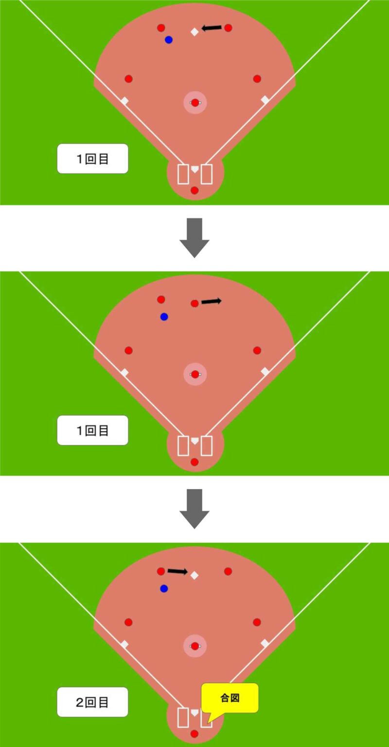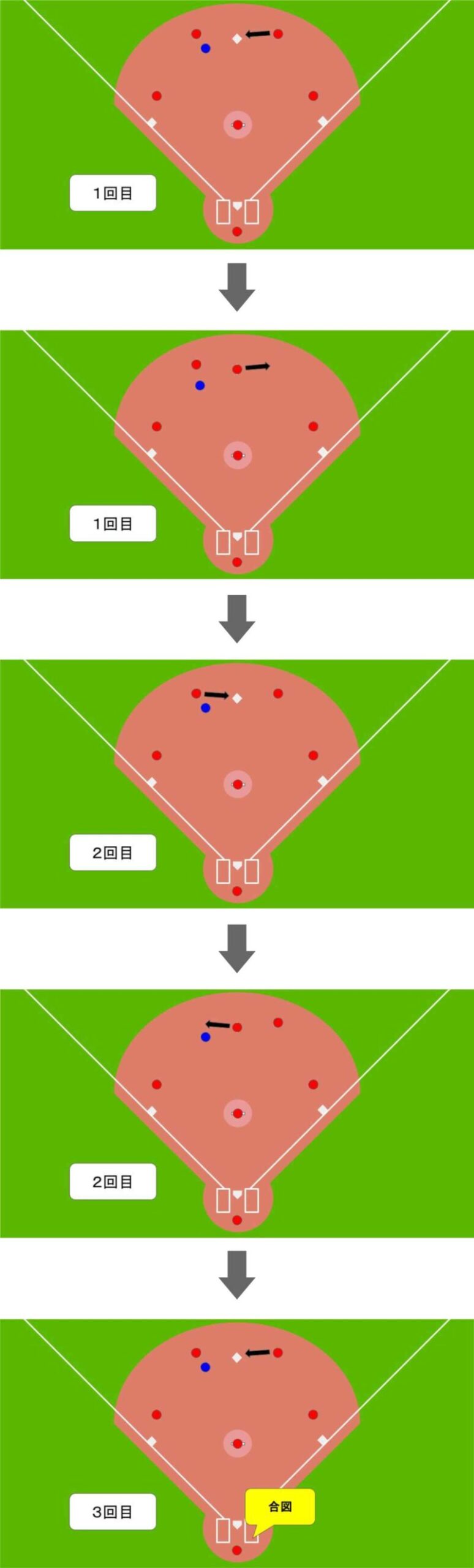 牽制のサインで回数と二遊間のどちらが入るかを決めます。動きは以下のようになります。