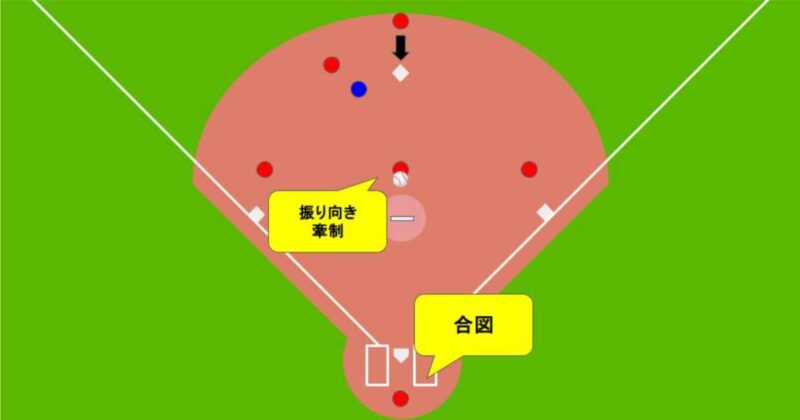 この牽制では、②のバッテリー間で投球のサイン交換をしている最中に捕手から投手に合図を送り、牽制します。